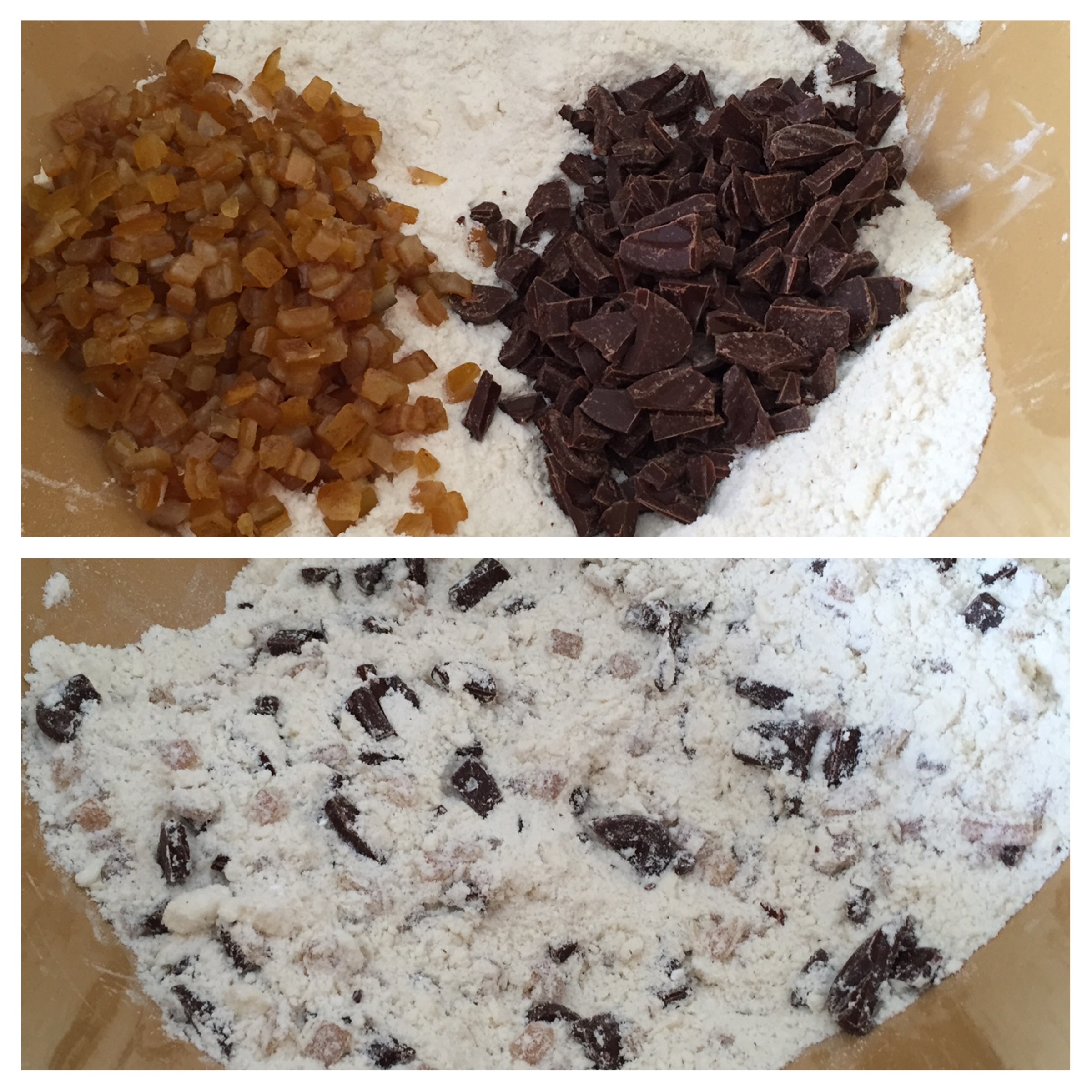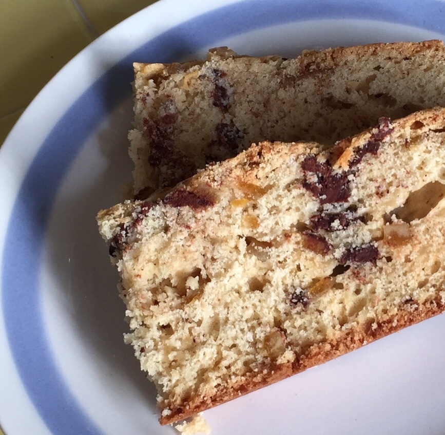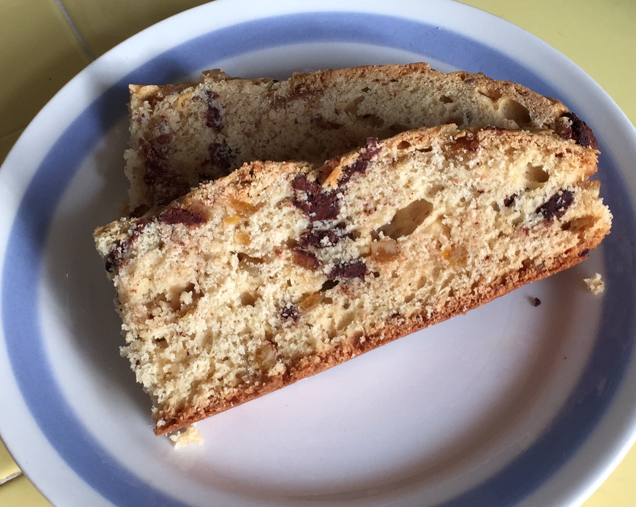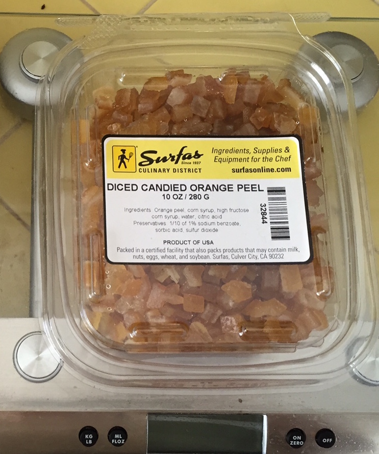 coarsely chopped and candied orange peel from local cooks’ store (oft mentioned here), Surfa’s. I’ve made this bread many times since, using orange peel from the Berkeley Bowl (similar to Surfa’s) and from the supermarket. The supermarket tubs (usually available only around the holidays) are a sweeter, stickier product. The orange bits tend to clump together in the bread, but it still tastes wonderful.