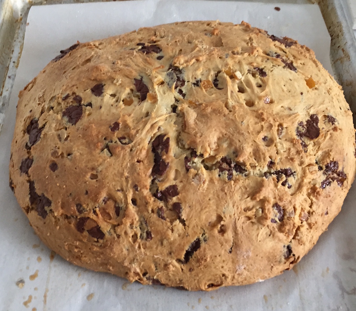 I first made this last December for a holiday event. The dough was so crazy sticky that I just mounded it onto the sheet and said a prayer. Holy patron saint of bakers, is this stuff delicious! I mean seriously. For its ease and nothing fancy ingredients, it comes together like a trip to heaven. I’d never made soda bread before. I think I’d had it once at a St. Patrick’s dinner 30 years ago and that version was too rusk-like for me. The chocolate and orange drew me in like a moth to a flame. And, turns out, that 30 year old memory? That was just a bad loaf.