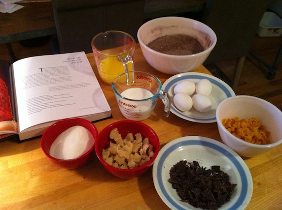 Melted butter, cocoa and flour, eggs, chopped apricots, chopped chocolate, almond paste, milk and granulated sugar.